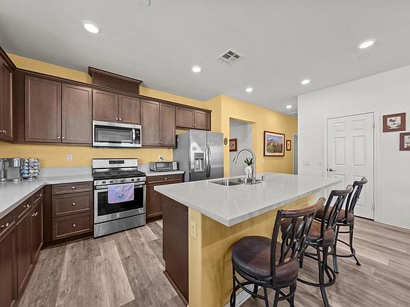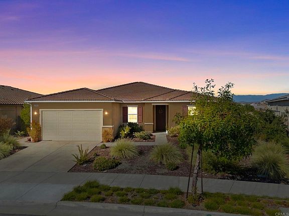 Welcome to your dream home in the heart of Winchester, CA! This beautifully maintained 3-bedroom, 2-bathroom residence offers 2,091 square feet of comfortable living space, thoughtfully designed with an open floor plan that’s perfect for modern living and effortless entertaining. The heart of the home is a gorgeous, upgraded kitchen featuring sleek finishes and ample counter space, opening seamlessly to the dining and living areas. Step outside to your own private entertainer’s paradise—an inviting patio complete with a cozy fire pit, ideal for enjoying cool evenings under the stars. Also boasting mature fruit trees including apple, orange, tangerine, and lemon, along with two water fountains that enhance the peaceful atmosphere. What truly sets this home apart are the breathtaking, unobstructed panoramic mountain views from every rear window—no neighbors behind, just serene natural beauty. The community is quiet, friendly, and meticulously kept, with low HOA fees and the added bonus of leased solar for energy efficiency. Even the garage is a standout, featuring a durable epoxy floor for a clean, polished look. Located in a highly desirable area with close proximity to shopping and dining, this home offers a rare blend of peaceful retreat and convenience. Don’t miss the opportunity to own this incredible property—homes with views like this don’t come along often!