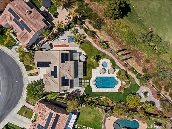 Stunning South Temecula home located in the gated community of The Fairways on one of Largest useable lots approx. 17,860 sq. ft. on 7th hole of Redhawk golf course. Sprawling layout, with tons of upgrades. Crown molding throughout most of the home, custom baseboards, PAID SOLAR, UV tint on most windows. Etched French door opens to an incredible tile inlay entry with mosaic tile detail. Living/dining rooms w/tile flooring & crown molding. Plantation shutters add sophistication - some w/pull down blackout shades. Gourmet Kitchen has it all! Granite counters, tile backsplash, large island, stainless appliances Viking cooktop/double oven and microwave, walk-in pantry, built in desk, eating area & French doors to the resort backyard! The huge family room is off kitchen and offers custom built-in media unit, ceiling fan & fireplace. Layout is highlighted with a downstairs bedroom/full bath. Split staircase leads upstairs where you will find a gorgeous master suite with large retreat along with a vaulted ceiling and views of the backyard and golf course. The master bath has dual sinks/vanity, granite counters, large soaker tub, separate shower and large walk-in closet. Other upstairs bedrooms have a private bonus room and balcony. The laundry room is also located upstairs. whole house fan. Entertainers Dream resort backyard is MASSIVE and has stunning pool & separate spa, multiple sitting areas, includes fountains, 2 fire pits, paver walkway, multiple fruit trees, Alumawood patio cover with sunshades, BBQ island, pergola, retaining accent wall & more! Wi-Fi controlled fountain, pool lights/heater and outdoor lighting. Newer high efficiency sprinkler system, Nest thermostats, 2 A/C units, 2 garages (Single and Double). Located in the boundaries of Great Oak High, convenient to shopping/restaurants & just minutes from wine country.