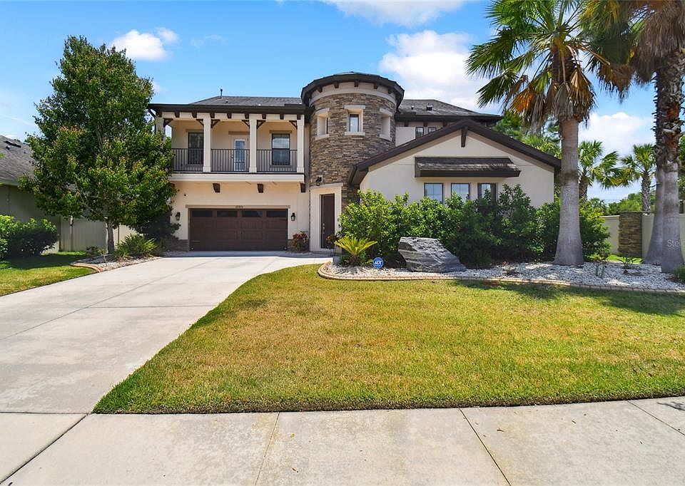 One or more photo(s) has been virtually staged. Situated directly NEXT to the gorgeous community pool, walking trails, water park, and community hub in the desirable Union Park, one of Wesley Chapel's highly sought after ultra-fi master-planned communities with amenities galore. This former Builder’s model home of the Madeira floorplan is designed to impress. From the fabulous curb appeal which encompasses SPLIT GARAGES, a STONE ROTUNDA front entry, and a front balcony where you can sit and watch the festivities from your own porch! The beautiful ROTUNDA FOYER welcomes you with SOARING CEILING into both the DEN or OFFICE featuring French doors and FORMAL DINING ROOM along with plenty of storage space. Now to the spacious gourmet kitchen overlooking the expansive grand room. The impressive kitchen features a GAS STOVE, UPGRADED HIGH CABINETRY, POT FILLER, TILED BACKSPLASH, EXTRA SITTING AREA, PANTRY, ISLAND WITH EXTRA STORAGE, and REVERSE OSMOSIS DRINKING WATER. The grand room’s grandeur is the GAS FIREPLACE with LIGHTED SHELVING and just off the grand room is the HALF BATH! Also located downstairs is ONE of TWO OWNER’S SUITES which could also be used as an in-law suite. UPSTAIRS you will find an additional OWNER’S SUITE with DOUBLE WALK-IN CLOSETS and SLIDERS that open to the expansive UPSTAIRS SCREENED-IN PORCH. Bedroom 3 has a BUILT-IN BOOKSHELF with SLIDING LADDER, and a door the opens to the UPSTAIRS FRONT BALCONY! Bedrooms 3 and 4 share a JACK-IN-JILL BATHROOM and Bedroom 5 can also be found upstairs. The spacious Media Room with SLIDERS OPENING TO THE OUTDOOR SCREENED IN PORCH comes with a WET BAR with fridge to host the best movie nights! Some other upgrades needing mentioned are beautiful PLANTATION SHUTTTERS THROUGHOUT HOME, WHOLE HOUSE CENTRAL VACUUM SYSTEM, CUSTOM BUILT-INS, AIR CONDITIONED THIRD CAR GARAGE, UPSTAIRS and DOWNSTAIRS SCREENED IN PORCHES and UPSTAIRS BALCONY, JACUZZI TUBS, GUTTERS, IRRIGATION SYSTEM, EXTENDED DRIVEWAY, DOUBLE PANED WINDOWS, 5 1/4 BASEBOARDS, NEW UPSTAIRS VINYL FLOORING, RIGHT NEXT TO COMMUNITY POOL AND WALKING TRAILS. Union Park is a master planned community with much to offer and this home is within walking distance to it all: TWO RESORT POOLS, SPLASH PAD, CLUBHOUSE, WALKING TRAILS, PLAYGROUND, FITNESS TRAILS, and DOG PARK. Included in the fees are all your Internet needs as well as basic cable. Ideally located within minutes to 2 hospitals, malls, Center Ice, I-75 and I-275. Make this your home today!