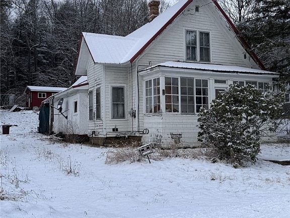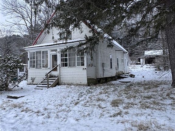 Rural property that would be perfect for a camp or a first-time home buyer, does need some TLC. The kitchen is definitely camp style, make this your own design with a walk-in pantry. Laundry room. Two bedrooms on the first level and two bedrooms on the second level. Front enclosed sunporch and side enclosed porch. The home/camp does need some work but has potential. There are approx. three large sheds on the property. At one time there was a heater in the one shed. Walk-in partial basement. Public sewer and water well. Seller will not be removing any furniture, sold as is condition. The electric is on and gas has been shut off. Bathroom needs alot of work and toilet is cracked. Must be preapproved.