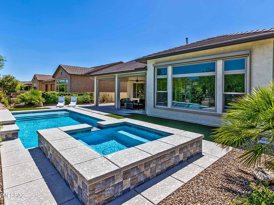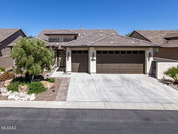 The best kept secret in SaddleBrooke Ranch. This highly sought-after Fresco floorplan is sure to impress with its sparkling pool and revitalizing spa. Enter through the elegant foyer to an expansive great room perfect for entertaining. The modern fireplace feature is truly captivating, and one of a kind. The separate Dining Area with its built-in buffet will be the highlight of any gathering. The chef's kitchen boasts Quartz countertops, stainless-steel appliances, and a designer backsplash. The luxurious primary suite, with its double-vanity and walk-in shower and closet, is sure to meet your every need or desire. The walk-in closet was expertly designed and built by California Closets, and is the epitome of high-end living. The separate guest suite has its own full en-suite for your guest's comfort and privacy. Both the front and back yards have been professionally landscaped with drought tolerant plants, low voltage lighting and a drip irrigation system. The private backyard features a mesmerizing pool and spa for your year-round enjoyment. Step onto the covered patio, and if needed, lower the retractable screens to create a cozy second great room, to fully enjoy the indoor / outdoor Arizona lifestyle. Finally, there is abundance of built-in storage, a large laundry room and a 2.5 car garage with plenty of room for your golf cart and hobbies, as well as a whole house water softening and filtration system to protect your health, plumbing and appliances. Move right in and start enjoying the vacation feel of luxury retirement living at SaddleBrooke Ranch!