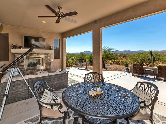 Sunrise! Sunset! Enjoy the sun coming up over the Catalina Mountains from the front patio and then view panoramic evening views over the Tortalita Mountains from the back patio. Relax on the covered outdoor patio room with a built- in fireplace and rolling screens. Inside an elegant stonework alcove with built in lighted shelves surround another cozy fireplace in the Great Room. Kitchen includes contemporary pendant lights, under cabinet lighting, walk-in pantry closet, and bar/buffet with wine cooler. The home has a den/office, ceramic tile floors, premium ceiling fans, & shades throughout. Hall linen storage, enlarged owner's walk-in closet, tiled shower/baths, expanded laundry room with full cabinets, full 3 car garage extended 4' extra feet w/ cabinets & workbench. Hurry!