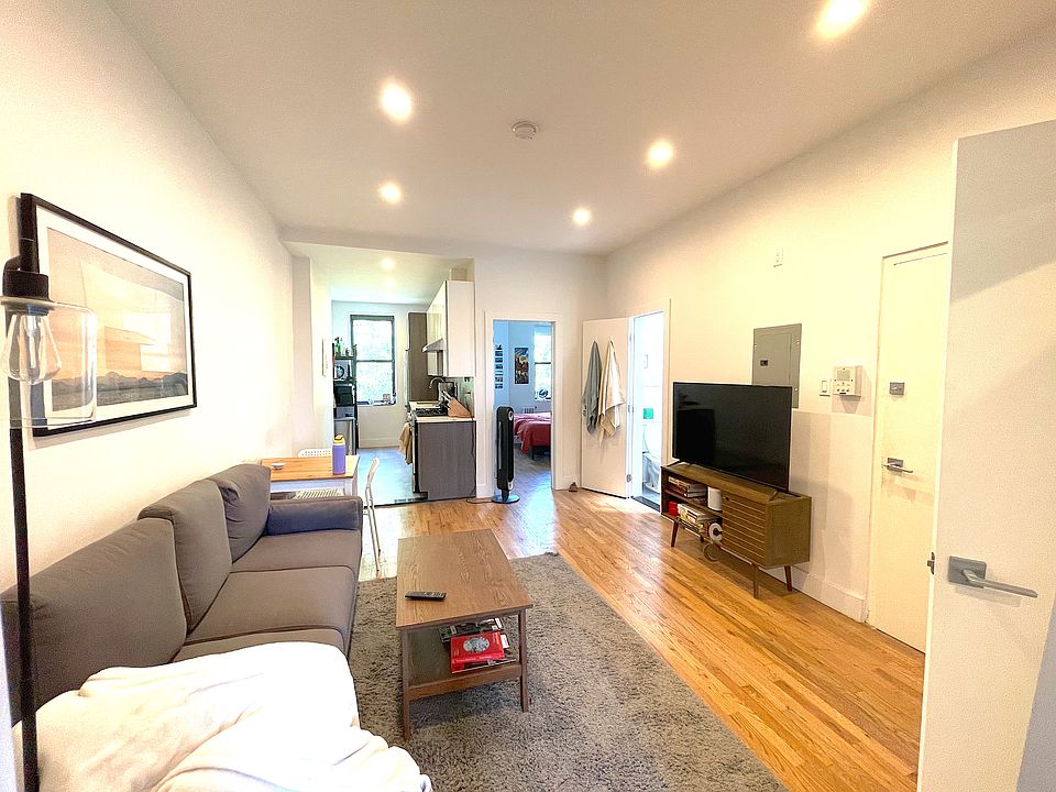 A renovated, sunny, top floor apartment in a Park Slope townhouse with three bedrooms and a washer/ dryer in the unit. It's in a great location, just steps away from 7th Ave shops, bars, and restaurants, and a short walk to the F/G trains and Prospect Park. The apartment features three separate bedrooms (2 large, 1 smaller), making it suitable for roommates, students, or medical students/residents. Guarantors are okay, and it's just 5 minutes away from Methodist Hospital. The apartment has hardwood floors, high ceilings, a good-sized living room, and a new kitchen with white quartz stone countertops, white and gray cabinets with plenty of storage space, and stainless steel appliances (including a dishwasher). Heat and hot water are included in the rent. Please note that dogs are not allowed. This apartment offers great value considering its size and location.