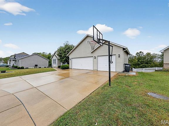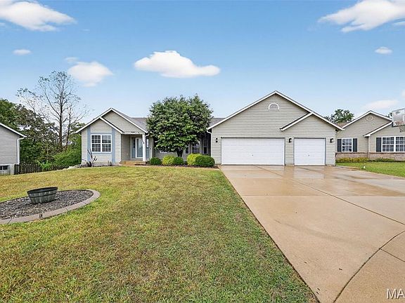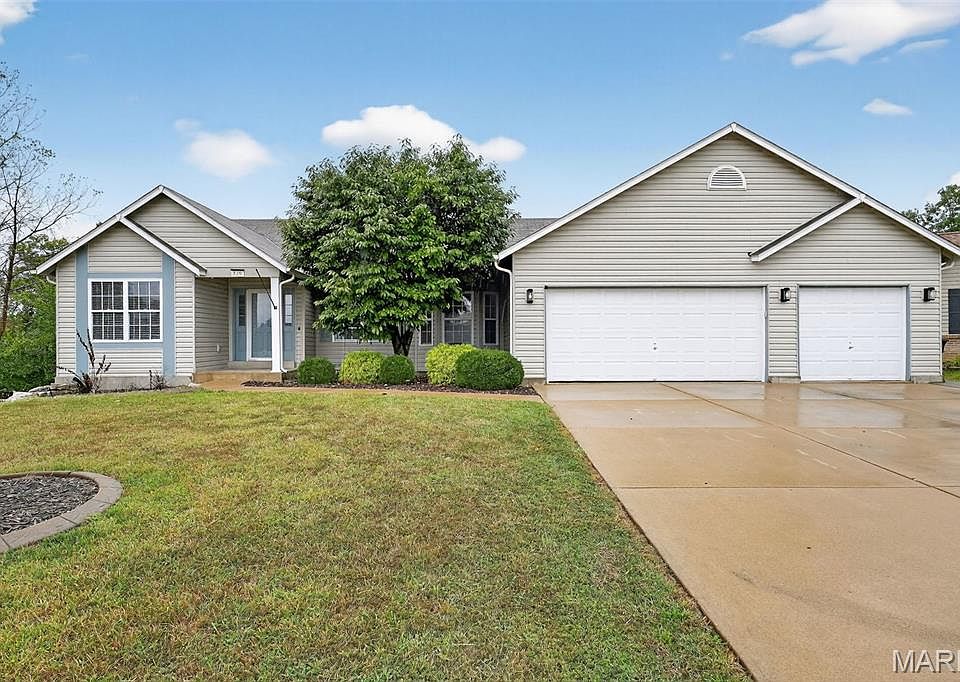 Spacious and open floor plan 3bed/3bath 3 car garage Ranch with walk out basement in quiet cul-de-sac . Inside you will be impressed with the vaulted ceilings, back wall of inviting out door light leading you through the sliding glass door to your back patio deck. Enjoy a cup of coffee, bbq and have a drink while you enjoy the peaceful moment on the back deck looking among the trees . Kitchen has butterfly island with plenty of space for seating, stainless steel appliances, and pantry. Separate dining area, Main Floor Laundry Room. Primary suite features spacious walk in closet ,en-suite with walk-in shower, dual sinks and separate soaking tub! Additional spacious bedrooms with ceiling fans, new carpet in both bedrooms and hallway bathroom complete the first floor. The lower level is a walk out, finished basement with rec room area, bar area, media room if you'd like, half bath, and plenty of room for storage. Wide backyard features wood fencing, deck, storage shed, and plenty of room for a future pool! Attached 3 car garage, equipped with ev charge port installed. New Roof installed 2024, partial siding was replaced in 2025. Award Winning Wentzville School District and Gateway Fiber available. located conveniently near Hwy A, highways, shopping and dining and close to GM