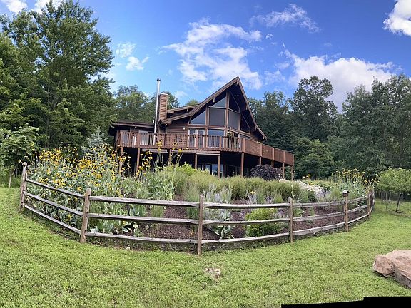 Breathtaking Mountain Retreat – A Rustic Gem! This stunning cabin/lodge-style home offers 2,849 finished sq. ft. on 8.74 acres, blending rustic charm with modern comfort. Floor-to-ceiling windows showcase expansive mountain views, while vaulted wood-paneled ceilings, a striking stone fireplace, and an open floor plan create a warm, inviting space. Inside, cherry and Brazilian hardwood floors flow through the living room, foyer, primary bedroom, and loft. The remodeled chef’s kitchen features stainless steel appliances, ample counter space, and a stylish tile backsplash. A cozy sitting room with a gas heater is perfect for morning coffee. The primary suite offers wood floors, ample closet space, and serene views. The loft bedroom provides a flexible space for guests or a home office complete with an attached full Bathroom. The fully finished basement adds even more versatility with luxury vinyl plank flooring, a spacious bedroom, full bath, rec room with a woodstove, wine room, and ample storage. Recent Updates: Water heater (2018) for efficiency Water pressure tank (2013) for consistent flow Repainted & sealed wood siding Bluestone slate on front porch & walk Outdoor Highlights: Wraparound deck to soak in breathtaking views Landscaped gardens plus space for a vegetable garden Fruit trees (pear, peach, apple) for homegrown produce Chicken coop conveys for fresh eggs daily Convenient Location: 5 miles to I-81 (Martinsburg, WV & Winchester, VA) 30 miles to I-70 (Hagerstown, MD) 80 miles to Washington, D.C. This mountain paradise won’t last long—schedule your private tour today!