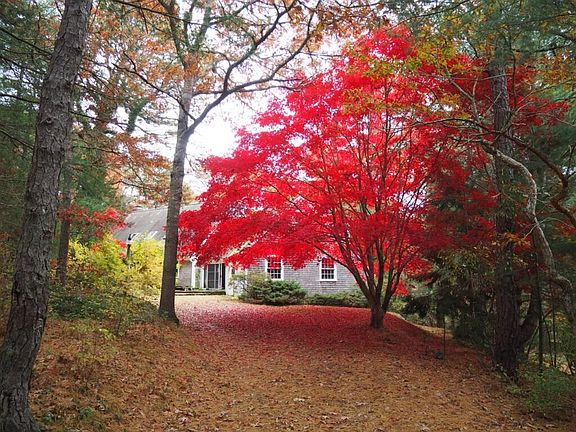 A super energy efficient, beautifully crafted post & beam home is your haven in delightful Cotuit. Boasting an R-38 full envelope insulation factor, this 4 bedroom, 3.5 bath in highly sought-after Cotuit Bay Shores, teems with nature, charm and privacy! Solid hemlock beams and spruce flooring abound throughout. The open and airy 1st floor boasts a cozy living room with handsome stone fireplace, dining room with French doors onto a small deck, a home office with built-ins, an expanded eat-in kitchen with custom wood cabinetry and cheery sitting area overlooking the tranquil backyard and a koi pond, plus a half bath. A large 3/4 year sunroom adjoins a spacious deck overlooking common acres of bird-filled woodlands. Upstairs is an expansive primary bedroom with private bath and w/i closet, two more bedrooms, each with a cathedral loft area, and a shared full bath with a jetted tub. A large 4th bedroom with ensuite bath is tucked above the oversized two-car garage--a great guest suite/studio/office! The walkout lower level features a fabulous den/playroom. Outside, the grounds are intricately terraced with Goshen Stone and planted to attract birds and butterflies. Cotuit Bay Shores' well-maintained private amenities, all walkable from the property, include a private beach on North Bay, assn. boat dock, kayak/paddleboard storage, four tennis/pickleball courts, bocce ball, playground, and extensive walking trails. A hundred-plus acres of conservation land across the street give access to crystalline Eagle Pond and more woodland trails. Your slice of Cape Cod heaven!