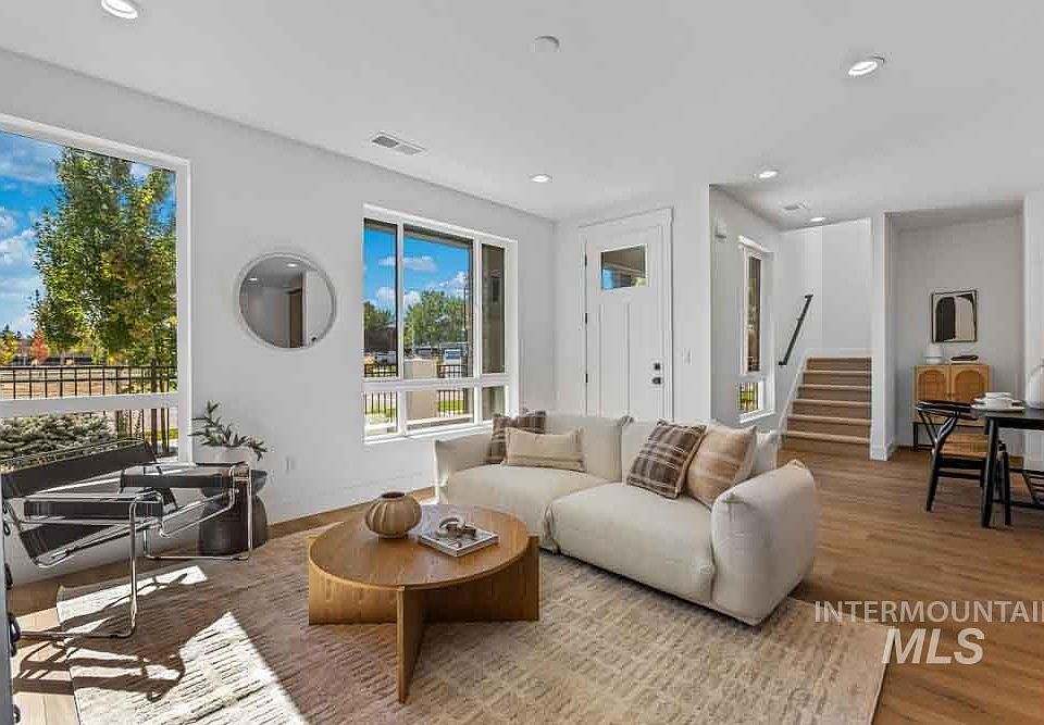 Introducing Molinari Park - Luxury Townhomes Redefined. The very last Naples floorplan in Phase 1 features a sought-after main-level master suite with a spa-inspired bath, dual vanities, walk-in shower, and spacious closet. A gourmet kitchen with stainless steel appliances opens seamlessly to the living room and covered patio, while durable LVP flooring adds style and function. The main level also offers laundry hookups for added everyday convenience. Upstairs, enjoy a generous bonus room with oversized balcony, two bedrooms, a full laundry room, and a private office perfect for remote work. Abundant windows bring light into every corner of this open-concept design. Beyond your door, Molinari Park offers a lock-and-leave lifestyle with future on-site dining, coffee shops, lush landscaping, walking paths, a dog park, and an unbeatable downtown Eagle location.