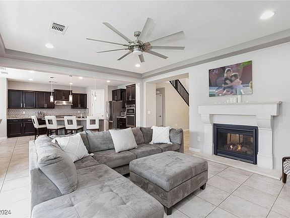 Set on a peaceful street with no rear neighbors, this stunning West Summerlin home offers breathtaking mountain views and awe-inspiring sunsets from its extended upstairs balcony. Located in the gated Segovia community within the sought-after Paseos village, this 3,315-square-foot residence features 4 bedrooms, 4 bathrooms, a spacious loft, a downstairs den/office, and a 3-car garage. The interior boasts a modern paint palette, upgraded dark espresso cabinetry, granite countertops, a 5-burner cooktop, an island, pantry, breakfast nook, and formal dining area, all designed for comfort and style. The well-landscaped backyard includes a large covered patio, retaining walls for added functionality, and plumbing ready for a future spa. Situated near highly rated schools, parks, walking trails, shopping, and dining, this home offers an exceptional lifestyle in the heart of West Summerlin.