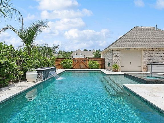 Resort-style living in the Heart of Covington. Welcome to this stunning one-story home on an oversized corner lot, ideally situated just off of LA-21-minutes from premier dining, shopping, medical offices and I-12 access. Step inside & be instantly drawn to the show-stopping Backyard Oasis, visible the moment you enter. The 26,000 gallon heated pool & 8-person spa are surround by sleek black mosaic glass tiles that shimmer in the sunlight. The white travertine decking, waterfall w/fire feature & a garage-style door that opens directly into the pool area create the ultimate space for entertaining. Perfect for hosting gatherings, crawfish boils or simply relaxing in style.