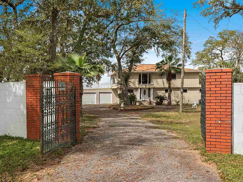 Decorative gates and block fence allows you a panoramic view of Escambia Bay and a unique home that offers many possibilities - 2 living areas - 1 upstairs and 1 downstairs - 1st level features a large great room with a brick raised hearth fireplace, a large owners suite w/sitting area and a connection room w/hot tub, separate shower and large walk in closet - 2nd level has large living/dining combination that opens to a screened porch ideal for catching the afternoon breezes, 2 bedrooms and a bath, kitchen with double ovens and glass cook top, solid surface counters, tile back splash and breakfast area. There is also a dock for your boat, and an adorable playhouse. The upstairs suite has a hot tub addition to the master bath, a screened balcony and an open patio over the 2 car garage.