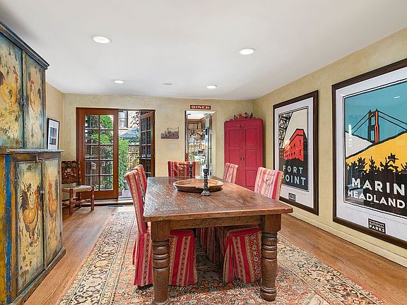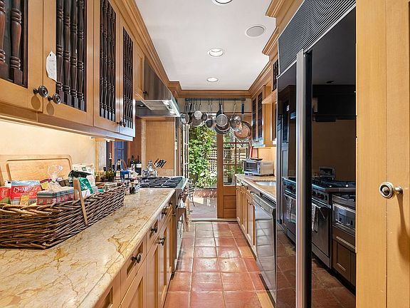 The kitchen features top-of-the-line appliances, including a Wolf Professional 6-burner stove, a 36” Sub-Zero refrigerator, and a garbage disposal. For added ease when entertaining, a dumbwaiter connects to the catering kitchen above, ideal for hosting gatherings. The kitchen's direct access to the backyard makes al fresco dining and serving effortless.