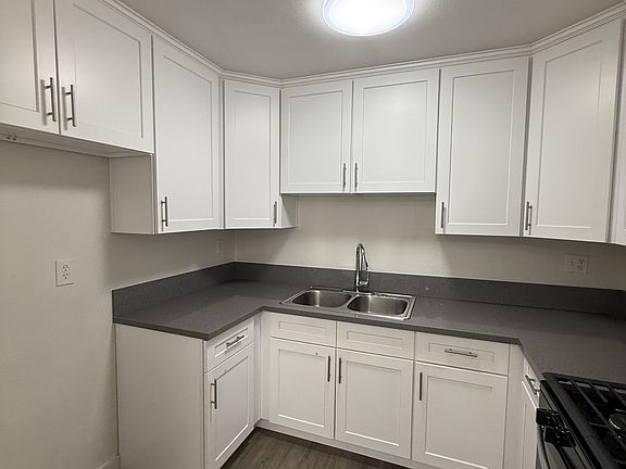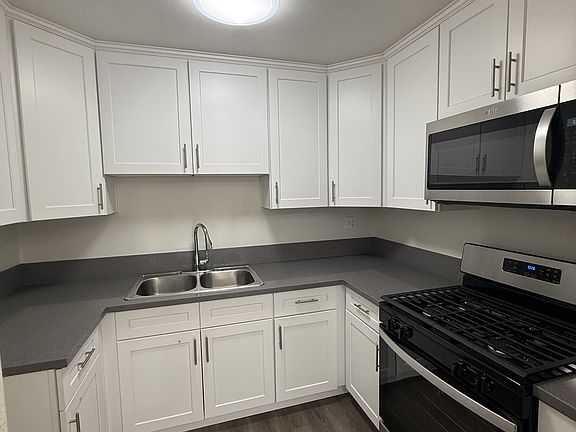 Fresh paintStainless steel sinkTile flooringBeautiful gray quartz countertopsWhite shaker cabinetsAdditional storage closetUpdated kitchen
