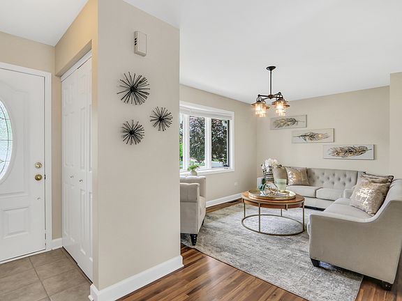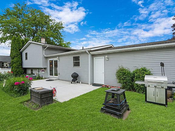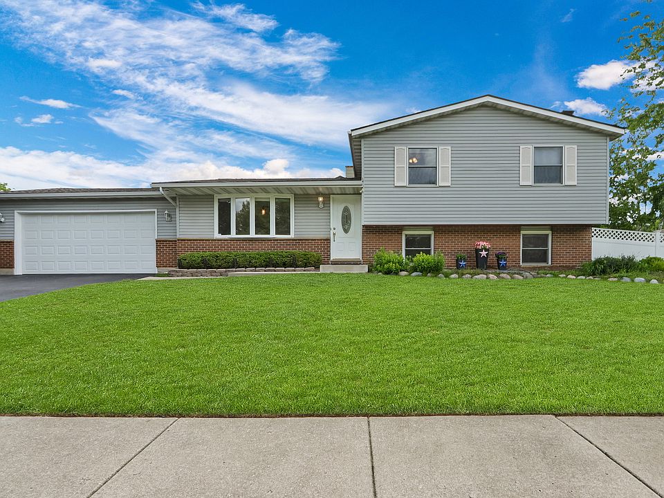 WELCOME HOME! This stunning split-level home located in District 56/121 is a gem that just hit the market. Step inside to be greeted by lush hardwood floors and an abundance of natural light. The fantastic open floor plan is perfect for entertaining. The living room, adorned with a modern light fixture, provides an inviting space to relax or host guests. Head to the AMAZING updated kitchen, the true heart of the home. You'll find GORGEOUS cabinets with beautiful moldings, a HUGE center island, granite countertops, a stylish backsplash, and gleaming stainless steel appliances. The comfortable eating area overlooks the backyard, making it the perfect spot for casual dining. On the lower level, enjoy the lovely family room with a cozy brick fireplace and plenty of space for everyone. An additional 4th bedroom or office completes this versatile space. Upstairs, discover three bedrooms and a fully updated bath. All bedrooms offer ample closet space and newer carpet. The backyard is a true oasis, featuring a beautiful concrete patio and a fenced-in yard, perfect for outdoor entertaining. This home is a MUST SEE!