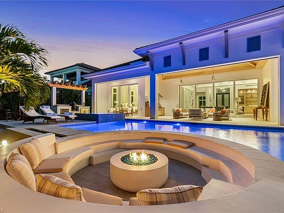 Modern Coastal Luxury Meets Biophilic Design in The Moorings — Minutes from Downtown Naples and the Beach Experience refined coastal living in this custom Borelli-built estate home that masterfully blends modern elegance, natural elements, and indoor-outdoor living. This 4,314-square-foot single-story residence was designed with a meticulous focus on biophilic design, seamlessly connecting the beauty of nature with sophisticated architectural detail. From the moment you enter through the grand double entry doors, your eyes are drawn through the open-concept living area to an outdoor entertainment oasis featuring a stunning 6-foot driftwood sculpture suspended over a sunken circular lounge with a fire pit and swim-up bar, flowing effortlessly into a resort-style pool and spa. Inside, you’ll find washed oak hardwood floors, soaring detailed ceilings, and luxury finishes throughout. The open-concept floor plan connects a chef-inspired kitchen—featuring Taj Mahal quartzite countertops, Sub-Zero and Wolf appliances, custom wood cabinetry, and a walnut wet bar—to elegant living and dining spaces perfect for both intimate gatherings and grand entertaining. This 4-bedroom + office + media OR 5 bedroom + den/flex room residence includes five full designer bathrooms. The media room with its custom built-in bar creates a stylish retreat for movies or game nights. The primary suite is a true sanctuary, offering dual custom walk-in closets, a soaking tub, oversized walk-in shower with dual shower heads, and two private water closets. Designed for the Naples lifestyle, the outdoor living area extends over 650 sq. ft. of covered space and includes a summer kitchen with grill and Green Egg station, electric roll-down screens, outdoor shower, and a fully fenced backyard surrounded by mature tropical landscaping. The southeast rear exposure ensures ideal sunshine over the pool during winter months. Additional upgrades include: • Crestron smart home automation • Generator (on order) • Integrated security and sound system • Two tankless water heaters • Electric roll down hurricane shutters • Split three-car garage with epoxy floors Located just minutes from 5th Avenue South, 3rd Street South, and Naples’ white sand beaches, this home offers private beach access through the optional Moorings Beach Park Association. Enjoy an unparalleled Naples lifestyle—morning walks on the beach, afternoons by the pool, and evenings dining in the heart of downtown. Whether you’re seeking a second home in Naples or planning a full-time relocation from the Midwest or Northeast, this residence delivers the perfect balance of sophistication, comfort, and coastal serenity.