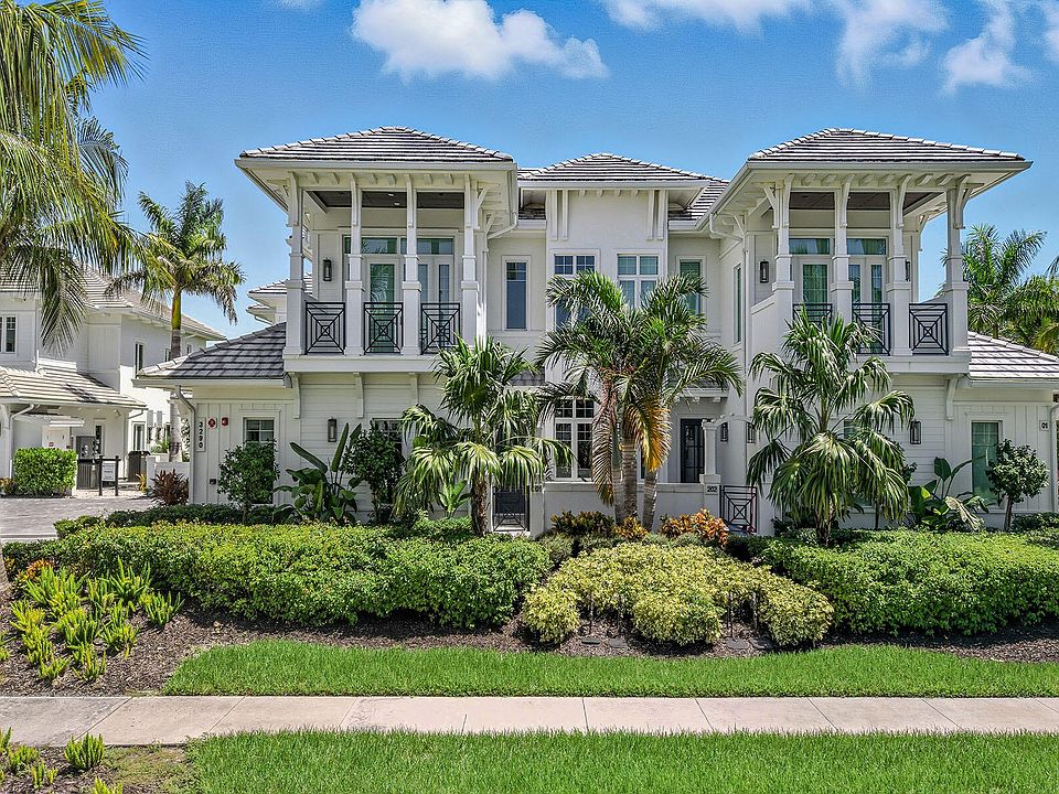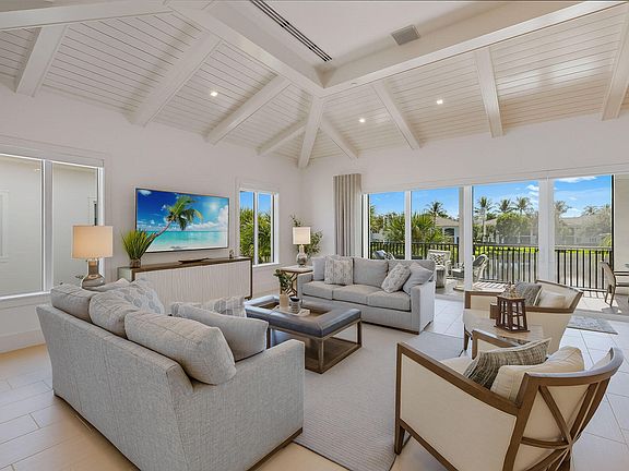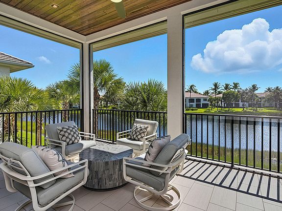 Discover tranquil lake and lush palm views from this beautifully furnished, light and bright Magnolia floorplan residence, quality built in 2020 by Gulf Bay Homes in the exclusive village of Dorado at Fiddler's Creek. With eastern exposure for gorgeous sunrises and a design that lives like a single-family home, this second-floor retreat offers three bedrooms plus a den, three-and-a-half baths, and a spacious two-car garage. The popular layout blends sophistication and comfort, enhanced by soaring volume ceilings, dramatic architectural details, and seamless indoor-outdoor living. A wood staircase with stainless accent rods leads to the impressive main living area, where 35'' x 11'' porcelain tile floors, recessed LED lighting, and custom ceilings set the tone. The great room exceeds expectations with a vaulted ceiling featuring shiplap and coffered accents, ceiling speakers, and water views through sliding doors with remote-controlled electric shades. The adjacent dining area includes a built-in dry bar with cabinetry and counter space, perfect for entertaining. The chef's kitchen boasts white cabinetry with glass-front uppers, in-cabinet and under-cabinet lighting, quartz counters, and a glass-tile backsplash. A full suite of Bosch stainless appliances includes a French-door refrigerator with freezer drawer, wall microwave, natural gas cooktop with hood vent, wall oven with convection, and dishwasher. An island with pendant lighting and bar seating, plus a pantry, completes the space, which flows effortlessly into the living and dining areas. The owner's suite is a serene retreat with coffered ceilings, stunning water views, and a spa-like en-suite bath offering dual quartz vanities with makeup counter, a frameless walk-in shower with bench, and an expansive walk-in closet with custom wood shelving. Two guest bedrooms each feature ensuite baths, one with French doors leading to a private tiled balcony. The den, accented with tray ceilings and crown molding, provides the ideal setting for a home office or study. Additional highlights include a powder bath, a well-appointed laundry room with quartz counters, and a two-car garage with epoxy flooring and a 240V outlet for EV charger. The screened lanai offers covered outdoor living with tile flooring, a tray ceiling with wood plank, ceiling fans, and recessed LED lighting, all overlooking tranquil lake views. With impact glass windows and doors throughout, this home combines elegance with peace of mind. Residents enjoy world-class amenities including a resort-style pool, spa services, fitness center with classes, tennis and pickleball program with TEN new pickleball courts, bocce, an extensive activity calendar, and casual and fine dining. Miles of sidewalks wind through the lushly landscaped community for walking, bicycling, and running, while optional immediate memberships for golf, beach, and marina elevate the SWFL lifestyle-including a recently renovated golf course and brand-new golf clubhouse.