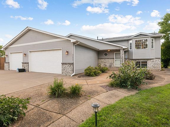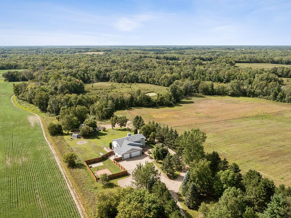 Magnificent 5-acre property that offers country living with so many amenities! 2-full kitchens with a full guest suite in the lower level with separate walk-out entrance, plus a separate entrance to the attached garage! The attached garage offers heated floors, mini-split AC & heat, pellet stove heat, water, a floor drain & walkout access to the fenced in yard & patio! Additionally, the insulated outbuilding has its own electric & a floor drain! The entire walk-out lower level has in-floor heating, walk-out family room with an entertainment system & office. Upstairs you'll find a spacious kitchen w/ center island, a perfect dining room & living room w/ fireplace and breathtaking views of your property! 3 bedrooms on this level including the Primary Suite w/ gorgeous full bath! Imagine life in the country on your private 5-acre property w/ woods & trees surrounding. Incredible views, quietude of nature, yet so comfortable & modern inside your home! Just minutes from Cambridge & 1 hour to the cities!