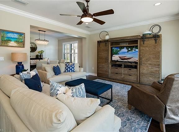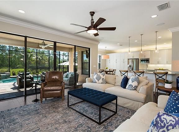 Wonderful opportunity to purchase a highly customized Conrad model on one of the best lots in Riverstone! Professionally decorated and over $175,000 of interior and exterior upgrades make this impeccable home show like a model while offering the ultimate in comfort, family living, and gracious entertaining. Nestled on an oversize cul-de-sac lot surrounded by private, serene preserve and lake views, the classic, open floor plan flows seamlessly showcasing beautiful hardwood floors, plantation shutters, Restoration Hardware lighting and rich moldings throughout. Spacious, gourmet kitchen with granite countertops, stainless appliances and double oven opens to a warm and inviting family room and fabulous resort inspired outdoor living area featuring a custom saltwater pool & spa with relaxing sundeck and upgraded nighttime lighting. Travertine decking and an outdoor kitchen complete the livability and beauty of the backyard living space. "A" rated schools and countless resort amenities include resort style & lap pools, har-tru tennis courts, basketball courts, fitness center, tot lot, social activities & more. Enjoy all the best this special home and the Naples lifestyle has to offer!