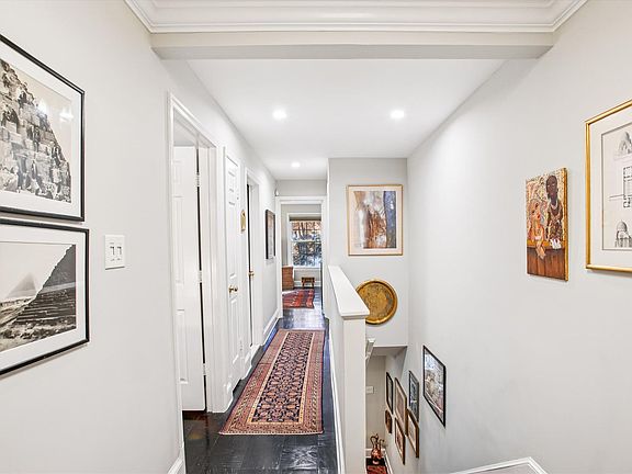As you walk in, you'll find beautifully maintained black parquet floors throughout both floor levels. The top floor hosts two spacious bedrooms and two full baths. Off of the welcoming foyer, you'll find the 1st bedroom and a hallway bathroom next to it. Continue through the long hallway and you'll find a large closet for coats or additional storage with built-in closet system. At the end of the hall, you have the master suite with two closets, an en-suite bathroom, and two large windows overlooking the back patio. All bathrooms are fully updated with high-end tile flooring and fixtures.
