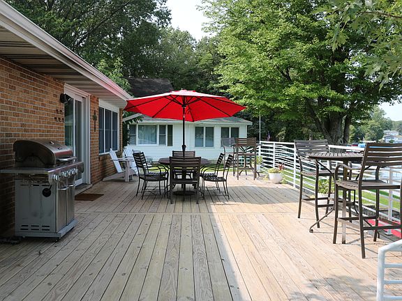 Little Crooked lake home in the acclaimed Haley Subdivision. This totally remodeled ranch brick walkout home offers the best of lake living. The 70' of pristine sandy beach frontage is spectacular. The sunsets are stunning. The spacious deck and patio offer awesome outdoor living space. Around a firepit on chilly evenings is perfect for roasting marshmallows. With an open concept floor plan, this home is great for entertaining. The kitchen, dining, and living rooms all have fabulous lake views with sliding doors to the deck. The master suite is on the main level with a huge vaulted ceiling bonus room used as a family and bunk area. The walkout level offers two bedrooms, one with patio access, and a rec room with a kitchenette. Laundry. Tiled flooring. Shed and outdoor shower.