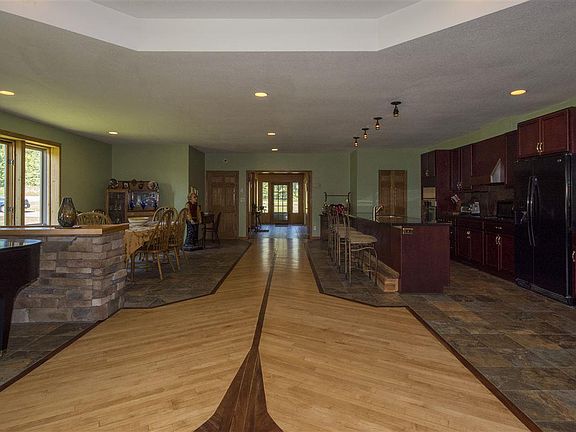 • Description: Hardwood approach with true north Mahogany accent, Step down to the conversation pit, Stone fireplace with cast-iron insert