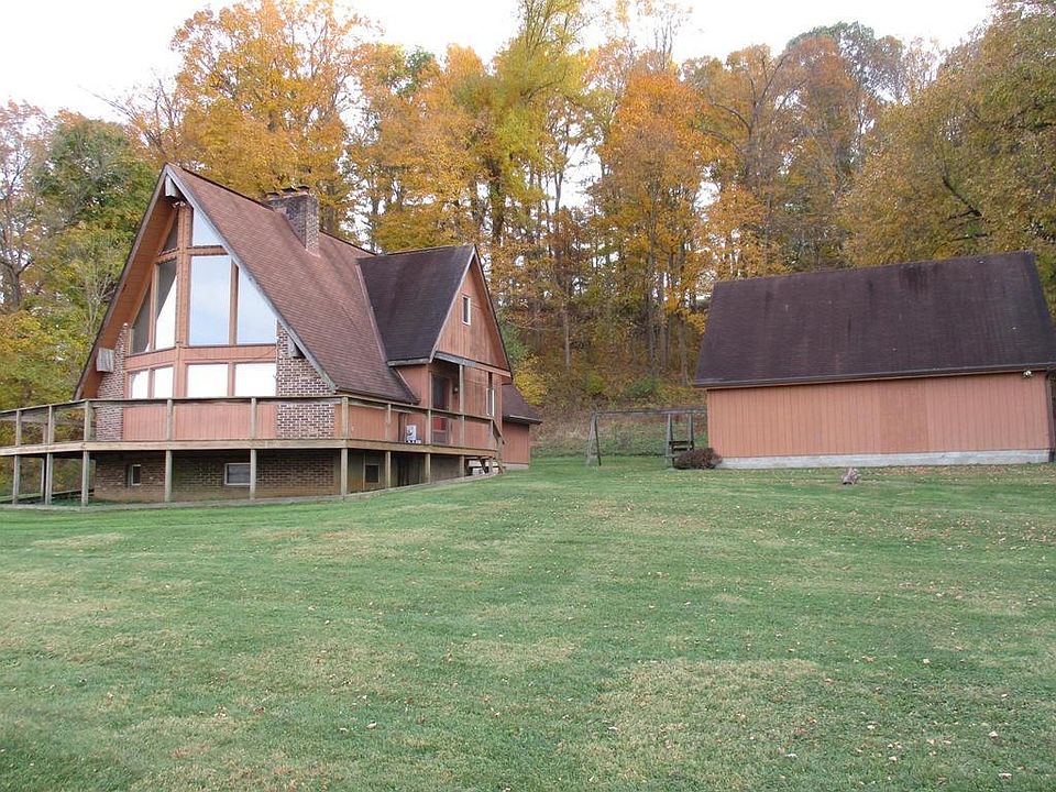 Private setting with an A-Frame having 4-5 bedrooms with 13X10 loft area and 12X5 computer area. Two story brick fireplace enhances the living and dining room area. Family room on lower level has brick wall for wood burner, a fourth bedroom and third bath also on lower level. This five acre lot includes some woods and hillside.