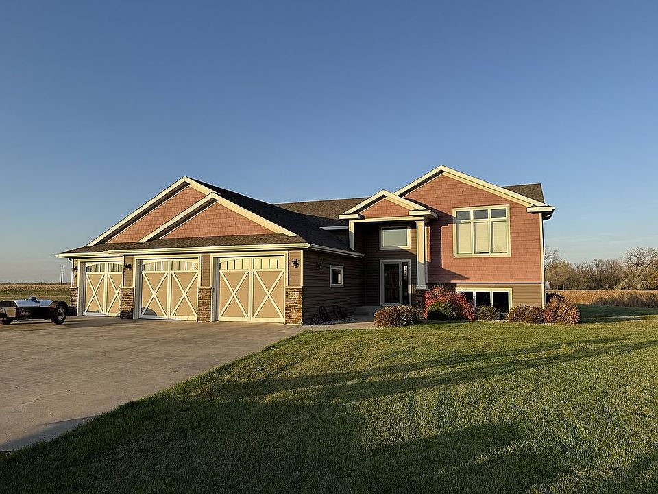 Spacious home in the country with great pond views offering wildlife observation throughout the year. This home is move in ready and just 3 miles West on 32nd Ave S offering a convenient location from Grand Forks. Main floor has solid hickory hardwood flooring in kitchen, dining and living room areas. All doors and wood trim are solid Knotty Alder, that provide a unique character to enhance the durabilty and finish of the home. Solid cherry cabinets throughout the kitchen and bathrooms with solid dovetail drawer construction and self-closing hardware. Rollout shelves in the pantry and island cabinets. Quartz countertops in the kitchen and primary bathroom. Spacious primary bedroom and two bedrooms are located on the main floor, with two additional bedrooms on the lower level. Large family room on the lower level, with option for future fireplace. Large office / rec room is adjacent to the family room, and could be used as an additional bedroom if desired. All doors and trim woodwork are solid knotty alder. Tile shower and floor in the primary bathroom. Andersen windows throughout the home. Upgraded mechanical systems include high efficiency Trane furnace with automatic humidifier and HRV air exchange system. Lower level and garage are boiler ready with in-floor heat piping and 2" foam under the concrete. Oversized garage is heated with fully insulated and finished walls. Stamped concrete patio in back yard. Large lot size has plenty of room for an unattached shop or storage building. Existing electrical service is upsized for a second structure. Wireless pet fence system is installed.