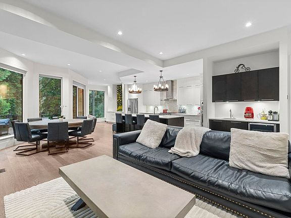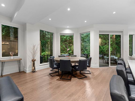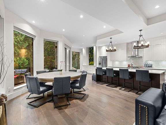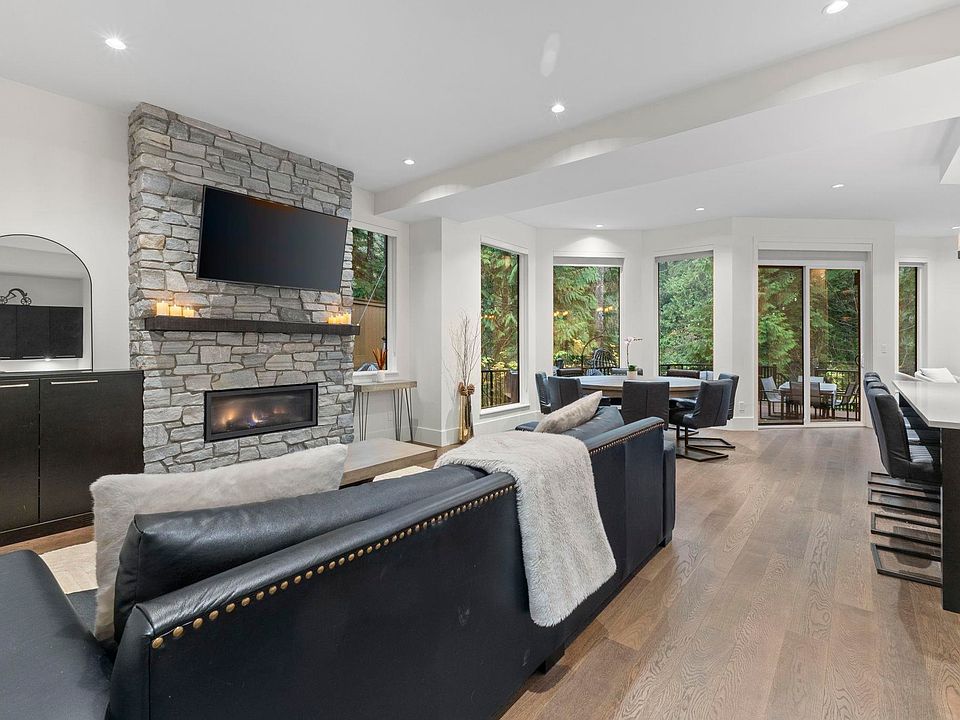 There’s living near the forest, and then there’s living in it. Just a 10 minute walk from Buntzen Lake, this custom modern home brings nature right to the glass line. Oversized windows frame tall evergreens, while warm wood and stone finishes wrap around two gas fireplaces. The chef’s kitchen features double ovens, one full fridge, one mini fridge, and one wine fridge. Spa bathrooms include glass showers and a deep soaker tub set beside forest views, perfect for quiet forest bath calm. A custom wine wall by a world renowned artist adds a striking focal point. Downstairs, a fully separate suite with its own kitchen, fridge, entry, and laundry offers true independence. Outside, decks, hot tub, and treed canopy create total retreat.