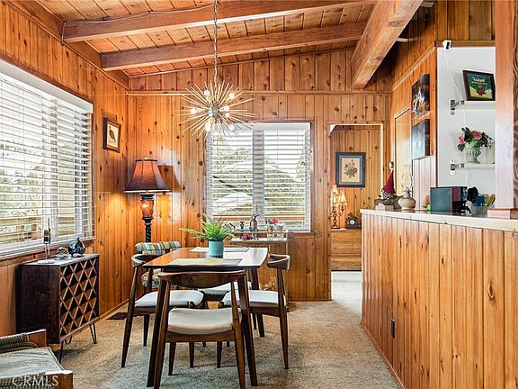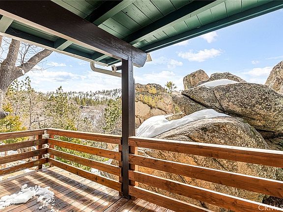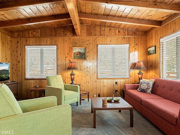 An absolutely stunning cabin with beautiful views of over 1 acre of Forested land along with snow-capped Mountain vistas, cabin is nestled among towering pines and California Oak trees with massive boulders throughout the property. Cabin exudes midcentury charm with rustic wooden interior.