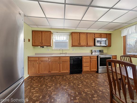 Lovingly maintained by long time owner, this mid-century ranch is a perfect starter or condo alternative! Enter into the spacious living room with neutral carpeting and built-in shelving. The kitchen offers oak cabinetry and plenty of dining space, and all the appliances are included. Conveniently located off the kitchen, the laundry room has a wall of built-in storage, including pull out drawers for your pantry items. Fantastic updated bathroom with neutral ceramic tile and decorative tile accents includes a double shower, seating, handrails, and a lovely sink/vanity and medicine cabinet. Enter into the bedroom hallway and you will find a coat closet, large linen closet, and an attic fan for those not-so-hot days. Nice sized bedrooms all have lighted ceiling fans, and the primary has a very large closet and vinyl doorwall leading to the backyard. Great location just a short stroll to restaurants, shops, and everything Berkley has to offer!