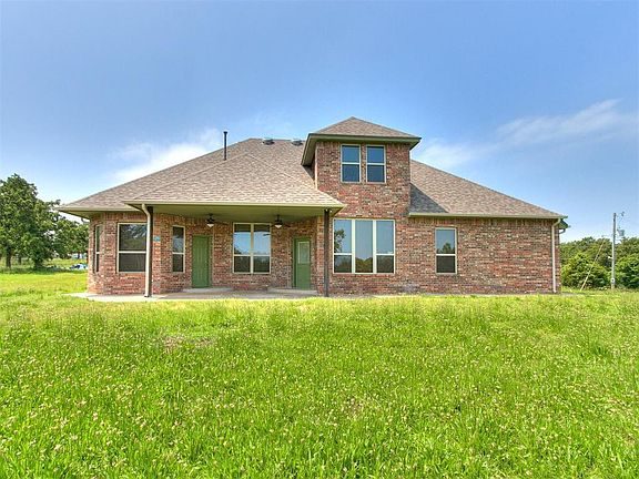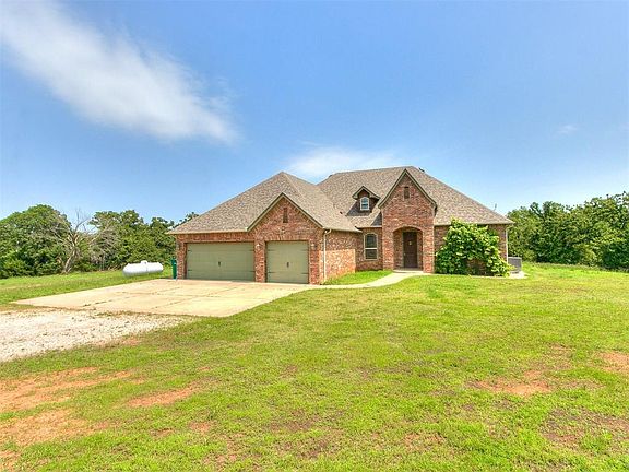 Come take a look at this private sitting on 3-Acres (mol) New carpet and fresh interior paint make this open kitchen/living, media room (optional 4th BR) and huge bonus room, ready to move in! Big walk in shower and large walk in Closet in primary bedroom. Wide hall ways & Doors. Kitchen hosts pantry and new microwave! Fridge can stay! Three car garage and storm shelter! Covered patio! Come take a look!