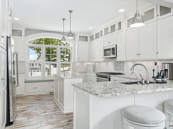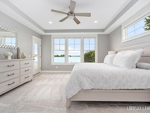 room. The finished lower level contains a wet bar, workout space, bedroom and full bathroom. Located across the street is no ordinary garage, it's a beautifully designed lakefront carriage house that combines premium storage with elevated living. The heated garage is ideal for storing lake toys, boats or transforming into a year-round entertainment space. Upstairs, a thoughtfully designed guest suite features a cozy bedroom, full bathroom, kitchenette and open-concept living room, all with stunning views of the lake. Enjoy outdoor living at its finest with multiple gathering areas including a lakefront patio with a gas fire pit, a second patio with an
