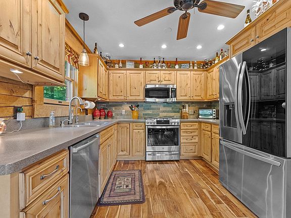 Tucked away in a peaceful neighborhood and backing up to the serene Timber's Recreation Area, this beautifully maintained log home offers the perfect blend of rustic charm and modern comfort. Surrounded by a lush, green yard, the property invites you in with a welcoming covered front porch—perfect for morning coffee, watching the many hummingbirds, or quiet evenings. Inside, you'll find warm hardwood floors throughout and thoughtfully crafted custom touches that give the home a unique, cozy character. The spacious living areas open onto a large back deck, ideal for entertaining or simply enjoying the natural beauty that borders the property. With two bedrooms on the main level, including a non-conforming third bedroom in the lower level, there's plenty of space for family, guests, or a home office. The lower level also has a wood stove that will heat the entire home if you choose. Please note: short-term rentals are not permitted in this area, preserving the tranquil and residential feel of the neighborhood. Whether you're looking for a primary home or a peaceful retreat, this log home is a true gem.