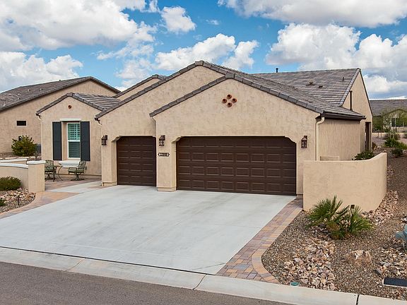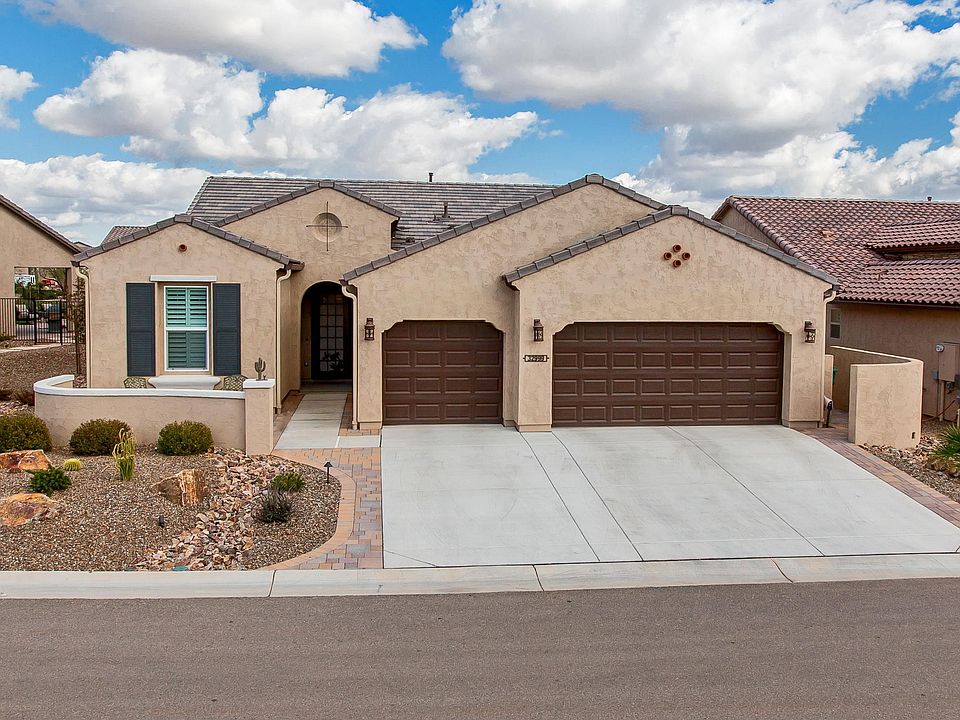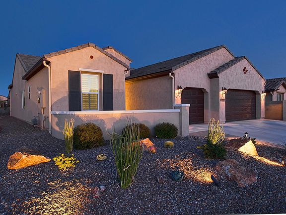 Highly sought after FRESCO model home is just two years new and boasts a view of the mountains from both the front and backyard. This beautiful home is welcoming and comfortable with a chic grey and white interior color palate that is stylish and inspired. Home is open and airy with numerous upgrades. *Thermofoil white cabinets, *entertainer's kitchen island, black ss appliances, *4' expanded great room, *extended laundry room, *office/den with built-in desk and cabinets, *buffet/bar in dining area. *extra large full three car garage with 4' extensions with 16' of built in cabinets and 8' workbench. *welcoming front porch and decorative door screen. and so much more. Why wait to build new? Start living the dream today in the active adult community of Saddlebrooke Ranch!