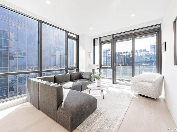 The primary suite is a luxurious escape, boasting a spacious walk-in closet and a beautifully appointed ensuite bathroom with Calacatta matte porcelain tiles, custom walnut wood veneer vanities, and radiant heated floors, creating a spa-like ambiance. The second bedroom, featuring a generous closet, is perfect for guests or a home office setup. Unit 9I also incorporates modern smart-home features, including a Latch Smart Lock System, offering seamless connectivity and security.