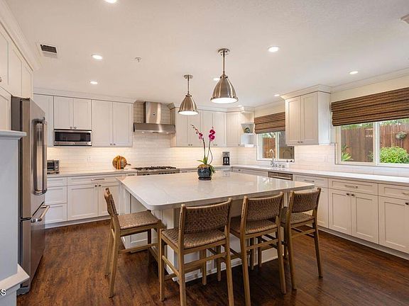 Step into a home where timeless elegance meets everyday comfort. This beautifully appointed 4-bedroom, 3-bath residence offers 1,885 square feet of refined living space designed to inspire. Soaring ceilings and an abundance of natural light create a warm, uplifting ambiance in the formal living and dining rooms--perfect for both quiet reflection and gracious entertaining. At the heart of the home, a thoughtfully remodeled kitchen features an expansive island, high-end appliances, and generous storage, inviting culinary creativity and effortless gatherings. The adjoining family room, complete with a cozy fireplace, offers a welcoming retreat for relaxed evenings.The intuitive floor plan includes a desirable downstairs bedroom and full bath, ideal for guests or multigenerational living. Upstairs, the serene primary suite boasts vaulted ceilings, dual closets, and a luxuriously remodeled bathroom--your own private sanctuary. Step outside to a tranquil backyard, where mature trees offer shade and seclusion, and a spacious patio sets the scene for memorable alfresco moments. Additional highlights include an interior laundry room and a 3-car garage, offering both functionality and convenience. Nestled near scenic hiking trails, local markets, pickle ball courts, Kimball Park, and the Ventura Aquatic Center, this home blends nature, community, and comfort into one exquisite lifestyle opportunity.