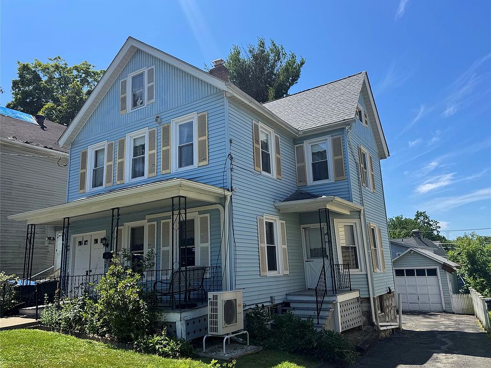 Old-style Colonial located in the heart of the Village of Walden. This home welcomes you with double entry doors opening into a slate-entry foyer. The first floor offers a spacious living room filled with natural light, a formal dining room, a convenient half bath, and a functional kitchen. The kitchen includes a washer and dryer hookup, over the range microwave, refrigerator, and a double sink. Adjacent to the kitchen is an enclosed mud room that provides access to the rear yard. The formal dining room features a brick corner with a chimney hook up, ideal for a pellet or wood-burning stove. The second floor features, three bedrooms and a full bathroom. The primary bedroom includes a walk-in closet, while two additional bedrooms provide comfortable living space and versatility. The second floor includes a staircase, leading to a spacious attic, offering ample storage and room to move about comfortably. This home is equipped with oil-fired hot water baseboard heating, ductless air conditioning, a propane powered generator, and a detached garage. The nicely sized rear yard offers ample outdoor space for endless possibilities for customization. This home showcases, beautiful natural wood features throughout, adding warmth and character. The Living Room is enhanced by classic pocket doors, offering both charm and flexible use of space.