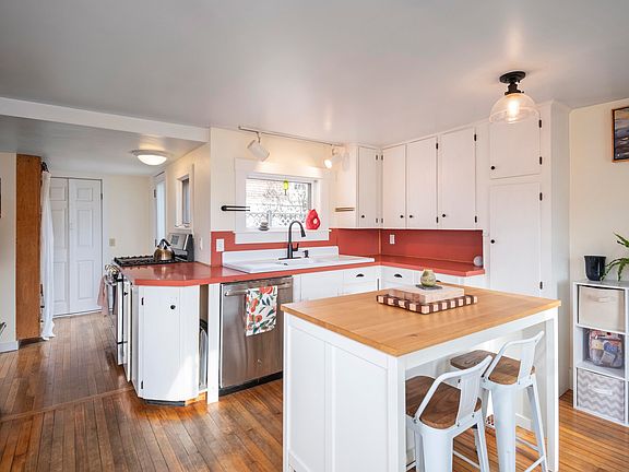 Solid, classic New England Farmhouse in the heart of Thomaston Village. You will feel the integrity and warmth upon entering this home offering wood floors, flowing floor plan, sunny rooms, updated windows, and classic features. A beautiful granite woodstove hearth with designated flu offers an additional heating source opportunity in addition to the hot water baseboard heat, if desired. There is a full bath on the first floor and three spacious bedrooms and full bath upstairs on the second floor. Off the sweet kitchen is an ample deck and private back yard for entertaining, pets, and outdoor activities. A fantastic attached barn has room for one car and a second floor for studio space, projects, and storage. Great location, so close for walking to restaurants, coffee shops, schools, sports fields, and public access to the St George River.