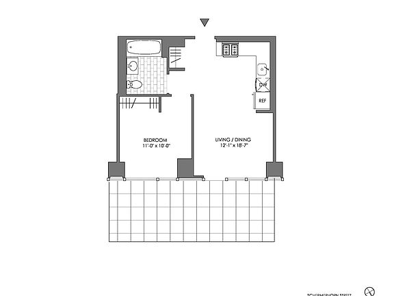 Gorgeous 1 bed apartment featuring an L-shaped kitchen, spacious living/dining area, ample closet space, floor-to-ceiling windows, and a large private terrace with northern exposure and views of Downtown Brooklyn.