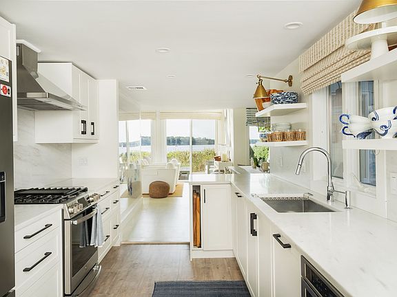 At the end of a quiet, private street, this modern waterfront residence rests on 0.43 acres+/- along the shores of Three Mile Harbor. The 2,671 SF+/- home spans 2 levels with 4 bedrooms, and 4 full and 1 half bathrooms, complemented by a 371 SF+/- pool house and detached garage. Defined by unobstructed harbor views, western facing sunsets, walls of glass, and seamless indoor-outdoor living, the property captures the essence of Hamptons waterfront living. With its rare blend of privacy, design, and direct beach access, the home offers an unrivaled coastal retreat just moments from East Hampton Village. Bordered by a sandy beach and nature preserve, the residence is immersed in tranquility while remaining only 3.6 miles+/- from East Hampton Village. A private trail leads directly to the waterfront, where calm waters invite swimming, kayaking, and paddle boarding. Boat enthusiasts will value the proximity of nearby marinas and the possibility of mooring directly in front of the property on navigable waters leading to Gardiner's Bay. The location also places residents within close reach of Sammy's Beach, Maidstone Park, Clearwater Beach, Gerard Drive, Louse Point, Round Swamp Farm, Si Si Mediterranean, Bostwick's on the Harbor, and East Hampton Golf Club. The interiors are defined by walls of glass and sliding doors that frame sweeping harbor views and bathe the home in natural light. An open living room with floor-to-ceiling windows captures breathtaking sunsets and extends directly onto a wraparound deck, emphasizing the home's seamless connection to its surroundings. Shiplap detailing, custom millwork, and modern tile flooring are paired with recessed and pendant lighting to create a warm, contemporary aesthetic. The eat-in kitchen features quartz countertops, a prep island with bar seating, custom cabinetry, and high-end appliances, seamlessly connecting to the dining and living areas. The first level opens with a foyer that includes a powder room, 2 coat closets, and a wet bar. A media room, dining area, and living room with floor-to-ceiling windows flow onto the outdoor living and dining terraces, all oriented toward the harbor. The eat-in kitchen is designed for both beauty and function, with quartz countertops, a prep island with bar seating, custom cabinetry, and a breakfast nook with banquette seating. One en-suite guest bedroom completes the level, providing comfort and privacy. The second level is anchored by the primary suite, which enjoys panoramic water views, 3 closets, a private sitting area, and a spa-like en-suite bathroom with a walk-in shower and dual vanities. Two additional guest bedrooms share 1 full bathroom with dual vanities, creating a versatile and welcoming layout for family and guests. From the upper-level vantage point, the home offers dramatic harbor sunsets and a rare sense of seclusion, heightened by the surrounding preserve and shoreline. Extending from the main residence, a wraparound deck and expansive outdoor living and dining areas overlook the harbor, creating a dramatic setting for alfresco entertaining against the backdrop of breathtaking sunsets. From here, a private trail leads directly to the sandy beach, offering effortless access for swimming, kayaking, or paddle boarding in the calm waters of Three Mile Harbor. The swimming pool, framed by a red brick patio with generous seating areas, adds a resort-like dimension to the grounds, complemented by a pea gravel dining terrace with seating for 10+ and a dedicated lounge for relaxed gatherings. Manicured landscaping and specimen trees provide privacy and structure, while bluestone walkways, a pea gravel driveway, an outdoor shower, and a welcoming front porch complete the home's refined outdoor experience. The 371 SF+/- pool house and detached garage serves as a dedicated space beside the swimming pool, offering flexibility for leisure, entertaining and parking. Its thoughtful design extends the living space outdoors and connects seamlessly to the manicured grounds, enhancing the property's resort-like character. Balancing privacy, modern design, and direct waterfront access, 33 Breeze Hill Road presents a rare opportunity to own a harborfront residence with a private beach, mooring potential, and endless opportunities for recreation on the water. Just minutes from East Hampton Village yet surrounded by natural beauty, this home combines architectural refinement, lifestyle amenities, and a premier location to deliver the ultimate Hamptons retreat.