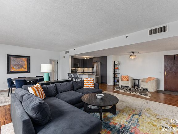 Welcome to The Plaza Tower Condominiums, an iconic address in the heart of downtown Grand Rapids. Perched high on the 27th floor, this impeccably maintained 2-bedroom, 2-bath residence offers over 1,300 square feet of refined living space with sweeping, panoramic views of the city skyline. Recently refreshed with a designer's touch, this home features fresh paint throughout, refinished kitchen cabinetry, and contemporary tile walk-in showers and flooring in both bathrooms. Modern lighting, upgraded hardware, and custom closet systems add a layer of sophistication and everyday comfort.