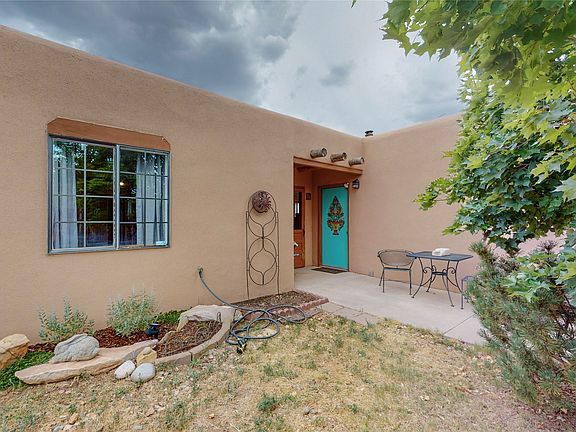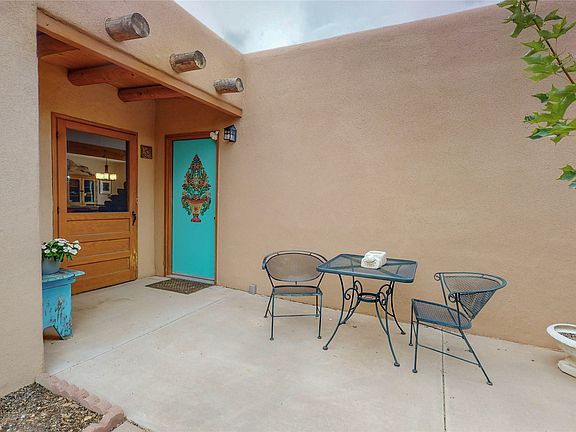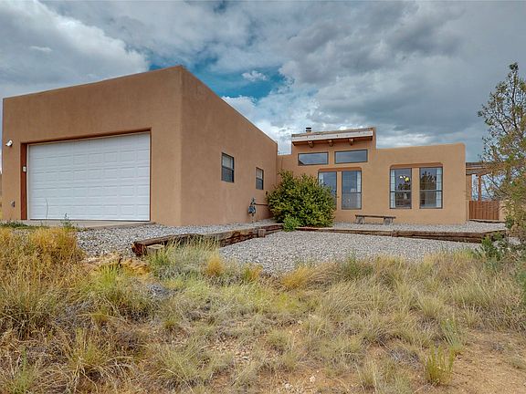 Delightful open plan passive solar 3 bedroom, 2 bath home with access to large Eldorado greenbelt. Wonderful soaring viga beams in livingroom and long south facing windows for winter light and heat. Natural gas forced air heating and central air cooling plus a wood stove for back up heat and ambience in the living room. Gleaming saltillo tile floors and adobe accent wall adds to Santa Fe pueblo charm. Sunset mountain views and privacy galore. There is an oversized 1car garage and an attached heated large 2 car garage for a studio or for all your toys. The home is on a 2 share well with the neighbor, and has a long circular driveway from a paved street. Access to all Eldorado amenities, local shopping and only minutes into Santa Fe