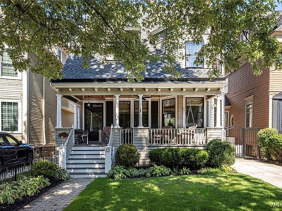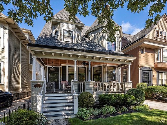 This Elmwood Village Victorian has one of the most inviting porches you will have the pleasure to sit on. The inviting southern facing residence has a beautiful foyer, with a large living room with a gas fireplace (NRTC,) bay window, hardwood floors throughout, and an open feeling. The spacious dining room has an artificial fireplace (NRTC,) and enough room for a bar! The updated chef's kitchen includes a wet bar with a wine chiller, an island, a large breakfast bar with seating, an additional space for a table or second seating area, and an adjacent half bath. All the stainless steel appliances are new, and the white cabinetry and neutral backsplash compliment the open space. The sliding glass doors from kitchen lead to a deck and outdoor entertaining areas. The 2nd floor has a large primary bedroom with an updated ensuite bath. There are 3 more bedrooms on the second floor; one is currently used as a library, with built-in bookshelves and artificial fireplace (NRTC.) There is an additional updated full bath off of main hall. The 3rd floor is totally finished with new windows, and is an extremely versatile space- it would make a great family room, home gym, or media room. There is ample storage as well as an additional full bath. The updated mechanics include a new boiler, hot water tank, and a 200 amp electrical service. The laundry area includes a new washer and dryer. The backyard is a private retreat in the heart of the city. There is a new Trex deck, stamped concrete patio, privacy fence, and shed. The new concrete driveway is large enough for 2 cars. A quick walk to Elmwood Ave shops and restaurants, and in close proximity to Delaware Park and the Buffalo Medical corridor-and steps to Canisius High School and Nardin Academy.