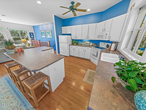 Beautiful & meticulously maintained 3BR/2.5BA one owner coastal home located on an expansive 168' x 154' lot on a QUIET CUL-DE-SAC on one of the most sought after streets in Ponce Inlet. The spacious THREE CAR GARAGE offers parking for multiple vehicles and ample storage space for beach & recreational gear! ONE BLOCK to the pristine ''no drive'' SUGAR SAND BEACH!! This immaculate one owner home boasts 2,042 sq. ft. of living area and is constructed of CONCRETE BLOCK ON BOTH LEVELS and has a TILE ROOF. STORM PANELS, TWO NEWER HVAC SYSTEMS and a TRANSFERRABLE TERMITE BOND provide added security and peace-of-mind. The upper level of the home features 10' CEILINGS, PLANTATION SHUTTERS, WARM COASTAL COLORS and gorgeous RED OAK FLOORING! The spacious open floor plan and large windows create an abundance of natural light highlighting a seamless connection to the outdoors! The comfortable main living area features French doors leading to TWO SEPARATE BALCONIES with durable Trex decking perfect for enjoying the outdoors!! The bright & inviting chef's fully-equipped kitchen boasts an island with bar seating and plenty of counter and cabinet space. White cabinetry & white appliances enhance the coastal aesthetic. The large primary suite also has beautiful lighthouse views, and the primary bathroom features decorative glass block a soaking tub and a separate stall shower. There's also a convenient half bath located on the upper living level. Two spacious guest bedrooms along with a guest bathroom & laundry area encompass the first floor living level and provide comfort and privacy for your friends & family. The oversized lot has mature trees & landscaping providing a beautiful setting & ample privacy. Flood zone "X", so flood insurance is NOT REQUIRED. Smell the salt air, hear the ocean surf & feel the ocean breeze! Walk or bike to the historic Ponce Inlet Lighthouse & Jetty Park, Marine Science Center, waterfront restaurants with entertainment, pickleball courts, marinas, charter fishing, parks, dog beach and much more!! Enjoy Florida coastal living at its finest!!