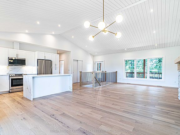 Discover The Perfect Blend Of Modern Comfort And Rural Tranquility Just Minutes Outside Of Bobcaygeon. This Stunning New Build Offers 3+1 Bedrooms And 3 Full Baths, Offering Nearly 3,000sqft Of Total Finished Living Space, Nestled On A Spacious 1-Acre Lot With Serene Views Of A Pond And Surrounding Farmland. Step Inside The Open-Concept Kitchen, Living & Dining Area, Where Vaulted Ceilings Create An Airy, Inviting Atmosphere. A Propane Fireplace, Featuring Aspen Cream Ledgestone And A Locally Sourced Timber Mantle, Serves As The Centerpiece Of This Elegant Space. The Main Level Boasts Engineered Hardwood Flooring Throughout, Adding Warmth & Durability. The Kitchen Is An Entertainers Dream, Equipped With Matching High-End Bespoke Line Samsung Appliances, Solid Surface Countertops & Backsplash, And Quality Cabinetry. Enjoy A Coffee Or Dinner With Friends From Your Raised Deck Off The Kitchen Overlooking The Neighbouring Pond. The Homes Thoughtful Design Continues In The Finished Walk-Out Basement, Complete With A 4-Piece Bath, Additional Bedroom, & A Convenient Walk-Up To The Oversized 26x37 Double Car Garage. Enjoy The Efficiency & Comfort Of A High-Efficiency Propane Forced Air Furnace, Central Air Conditioning, Propane Hot Water Tank, HRV, And Water Treatment UV System, All Supported By An ICF Foundation. Additional Features Include Main Floor Laundry, TV Cable Wiring In The Living Room, And Rough-In For A Central Vacuum System. This Property Comes With Full Tarion Warranty, Ensuring Peace Of Mind As You Settle Into Your New Countryside Haven. Don't Miss This Opportunity To Own A Beautifully Crafted Home In A Prime Location.