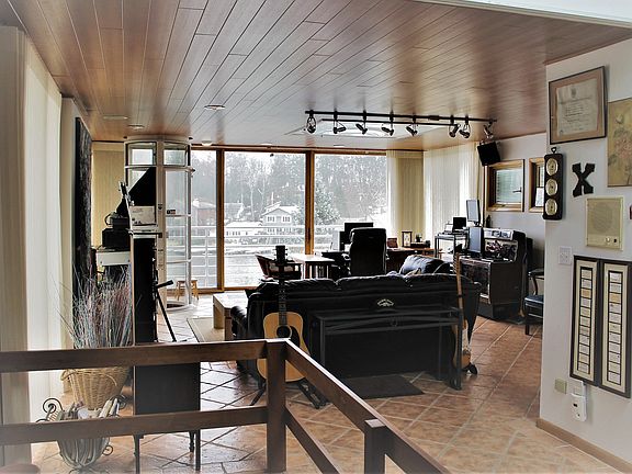 A HOME DESIGNED FOR ENTERTAINING! THIS CONTEMPORARY EXPANDED RANCH HAS TOO MANY FEATURES TO LIST ALL - BEAUTIFUL KITCHEN WITH GRANITE COUNTERS, STAINLESS STEEL APPLIANCES, 5 BURNER GAS RANGE AND BREAKFAST BAR. LR WITH WB FP, ELEVATOR TO ACCESS ALL 3 FLS, 12' SLIDING GLASS DRS TO FULL LENGTH DECK, MBR FULL BATH FEATURE HEATED FLS, ATRIUM WITH GAS FP. UPPER LEVEL HAS X LG SITTING RM WITH KITCHENETTE, FULL BATH AND BALCONY. LL OFFERS 3 BRS, LR WITH WB FP, DR, EAT-IN KITCHEN, FULL BATH AND LAUNDRY ROOM, 12' SLIDING GLASS DOORS TO FULL LENGTH PATIO. AQUARIUM WINDOWS 12'SLIDERS, AUX HEAT and AC (DUCTLESS) TRAVERTINE, PORCELAIN, and SLATE FLOORS. HEATED GAR. AN IN-GROUND POOL, DOCK 2 BOAT LIFTS AND LAKE VIEWS FROM EVERY ROOM MAKE THIS THE SUMMER ATTRACTION!! LOCATED WITHIN MINs TO MAJOR HWYS AND PUBLIC TRANS.