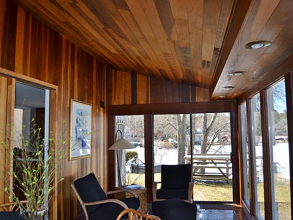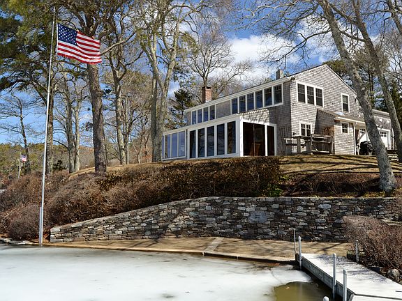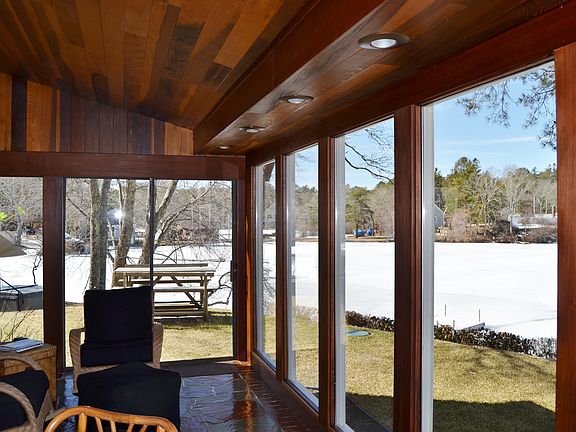 Waterfront Paradise! This truly amazing property is located on Island Pond with 250 feet of pond frontage, Western exposure for spectacular sunsets. Relax in the hot tub overlooking private dock and sandy beach. Beautiful pond views from every room. Open kitchen to dining area with 2nd fireplace. Spacious living room with stone fireplace, hardwood floors, built in book case perfect for entertaining. Sunroom with floor to ceiling glass, redwood ceiling & walls and flagstone flooring. Three bedrooms on the second level. Newly updated bath with granite. Master bedroom with vaulted ceiling, amazing views & a large walk-in-closet. Extras include 3 Story 2 car garage (24x30) with woodworking shop in lower level with room for expansion above, Home has all new windows, new natural gas heating system, new roof singles and new septic. Professionally landscaped with stone walls & walkways, mature plantings and irrigation system. Minutes to Route 3, 495, shopping, Cape Cod and the ocean!