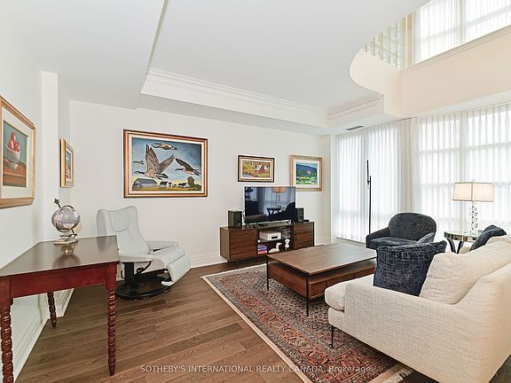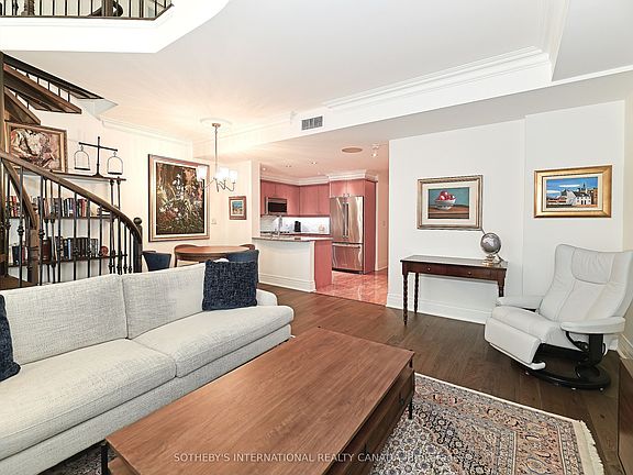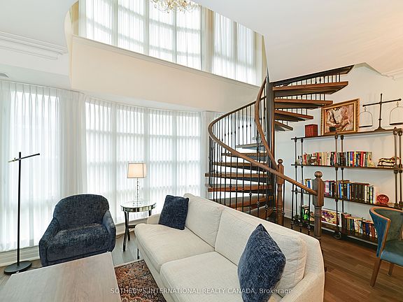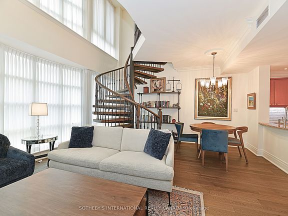 Chic and sophisticated 2-storey condo/loft; 1276sf of luxurious living space; terrific floor plan; renovated - new hardwood floors; staircase refinished; all marble has been refinished throughout, new drapes and remote control blinds; new top-quality broadloom in bedroom; large rooms; kitchen has gas cooking; stainless steel appliances; overlooks living/dining room combo; spiral staircase to a bright and spacious den (fits a pull out couch or Murphy bed); master suite has an extra-large walk-in closet as well as a double, huge ensuite with whirlpool tub and separate shower; lots of storage; locker; parking; great building amenities including indoor pool; concierge services; steps to Yonge subway, shops, restaurants, entertainment; ravine system.