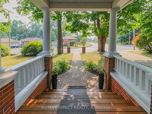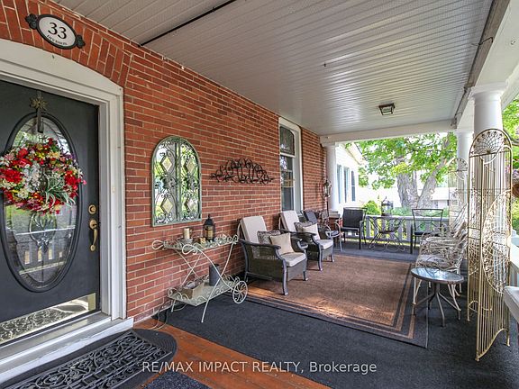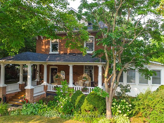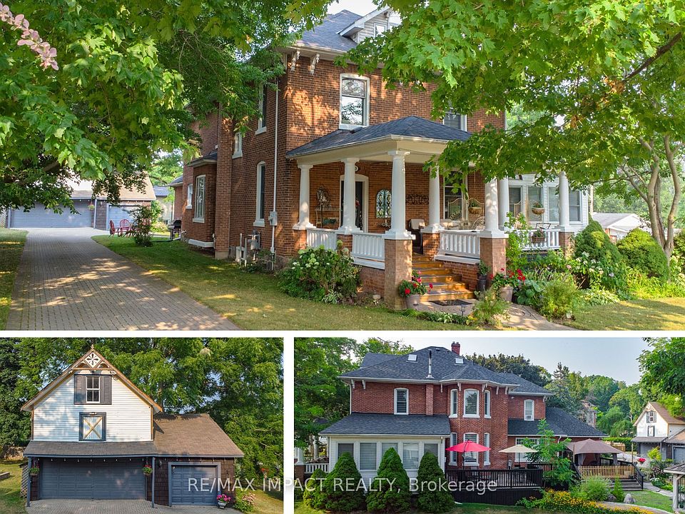 Welcome to this magnificent 2-1/2 storey brick CIRCA 1870's Century home, located in the downtown section of the Village of Colborne. This corner 0.63 acre lot with interlocking brick driveway running through the property provides access/egress to both Division and Creek Streets. The home's grandeur is one of the largest in the village, accentuated by a huge front veranda with white doric columns and ornate brackets under the wide eaves. Designed as an Italianate vernacular style, this Victorian home boasts an array of architectural details, including some window stained glass inserts, huge baseboards, extensive wood trim and hardwood flooring, glass door knobs, almost 10' main floor ceilings, plus a welcoming front foyer featuring a lit bannister and convenient powder room. The updated family kitchen showcases large porcelain tiles, a stylish white backsplash, s/s appliances and white cabinetry with quartz counters. The island includes a breakfast bar and the waffle white ceiling extends through to the windowed eating area. Off the kitchen, there is a convenient den, plus an expansive combined formal living/dining room with gas fireplace, hardwood floors and bay window area. Relax in the sunroom, complete with a cozy gas fireplace, abundant windows, stained wood ceiling, or step outside to the south deck with gazebo. The rear mudroom also features a gas fireplace with board-and-batten finished walls, plus access to full basement with concrete floor. Venture upstairs to the 2nd level with 3 well-appointed bedrooms, including a primary suite with a bay window and double mirrored closet doors. The upper level also features a large combination bathroom/ldry area with porcelain floor tiles, large walk-in shower, standalone soaker tub plus laundry facilities with front-load appliances. A spiral oak staircase leads to the 3rd level with a 4th bedroom, gas linear fireplace, round Palladian window dormer, skylights, plus 3-pc ensuite, mirrored closet and generous storage.