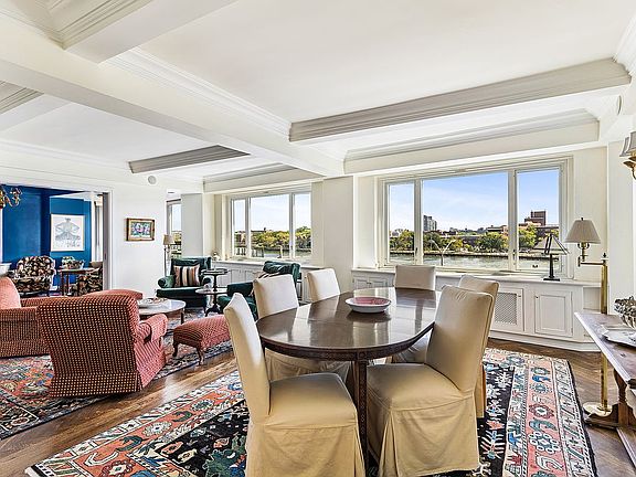 The oversized great room accommodates multiple seating areas for effortless living and entertaining, complemented by a separate den featuring more windows that continue to capture intimate East River views. A large eat-in kitchen-with separate stove and oven, dishwasher, and abundant space to reimagine-sits alongside a casual dining room.