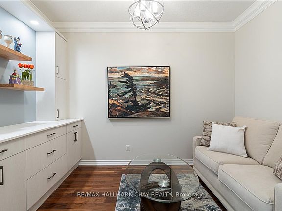 Custom One Of A Kind 2 Bedroom & Den, 2 Bath Suite At Nautica. 1,381 Sq. Ft. This model has been modified to have the second bedroom as a dining room and bar. It could be easily put back. Beautifully Finished With Hardwood Flooring, Crown Molding, 9' Ceilings, Custom Lighting, Loads Of Storage & Room To Entertain. Expansive View Of The Water From Living Room & Walk Out To Oversized Balcony Overlooking The Beach And Kempenfelt Bay, Enjoy The Sunrises & Sunsets. Customized Kitchen With Upgraded Appliances, Tile Backsplash, Breakfast Counter With Seating, Granite Counters, Pendent Lighting, Pot Lights, Full Height Cabinetry, And Oversized Pantry Cupboard. Spacious Den Has A Gorgeous Built-In Unit, Add a Pull Out Couch Or Murphy Bed For Guests. The Extended Living/Dining Area Has A Custom Built-In Wine Bar With Glass Cabinets Storage For All Your Extras. Full 4-Piece Main Bath Plus A Gorgeous Ensuite Bath With Walk In Shower, Jetted Soaker Tub & Upgraded Vanity. Ensuite Laundry Combined With Storage. Fantastic Social Activities And Rec Facilities. Indoor Parking, Locker, Steps To The Walking Trails, Beach, Marina and Go Station